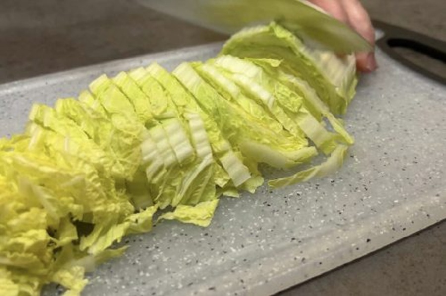 Sagriežam Pekinas kāpostus salmiņos un ievietojam salātu bļodā.