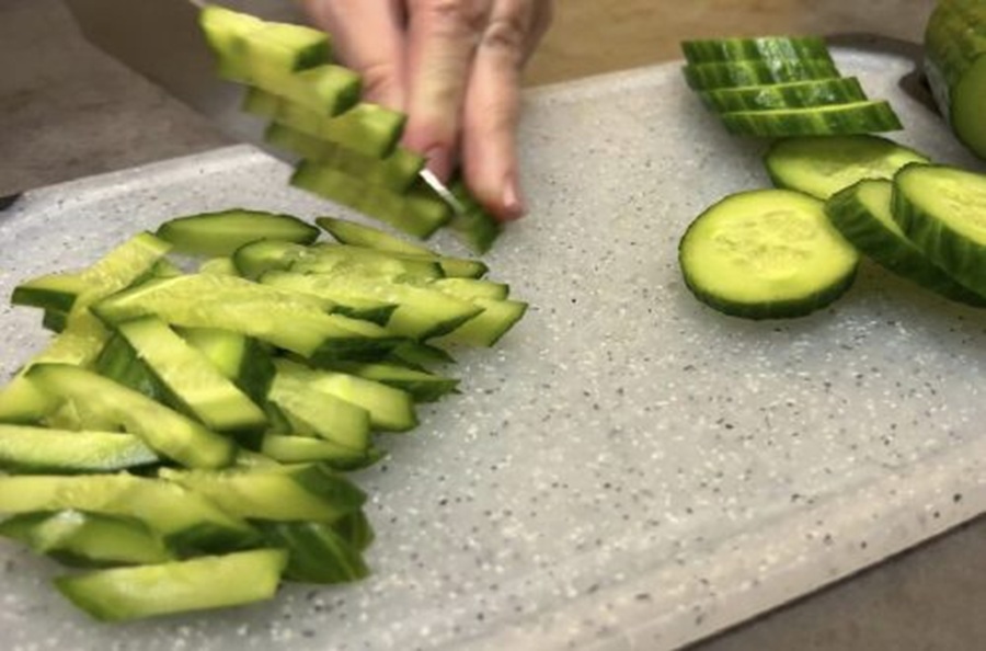 Tādā pašā veidā sagriežam gurķus. Visas sastāvdaļas var sagriezt arī kubiņos, bet es dodu priekšroku salmiņiem.