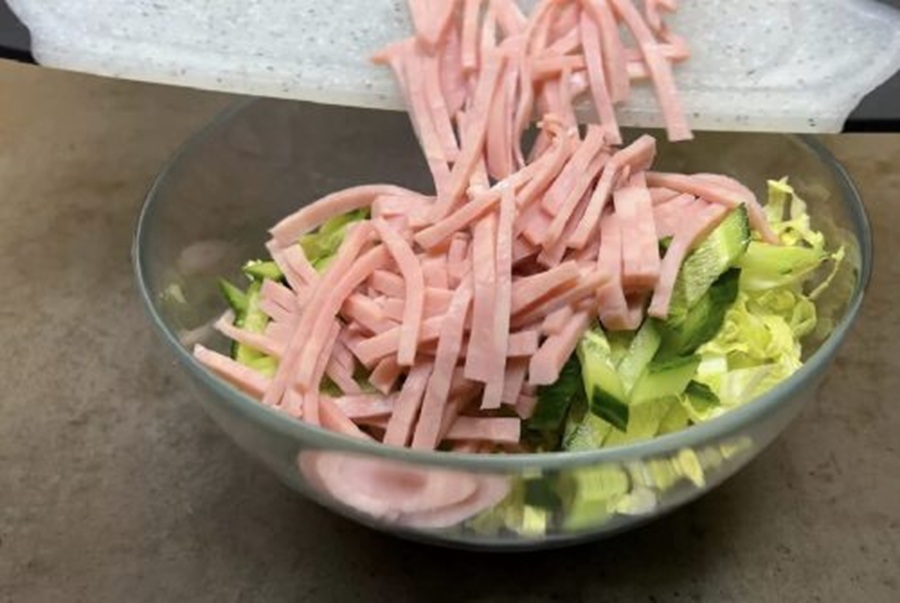 Sagriežam šķiņķi salmiņos. Tā vietā var izmantot arī vārītu vistas gaļu, kas sadalīta šķiedrās.