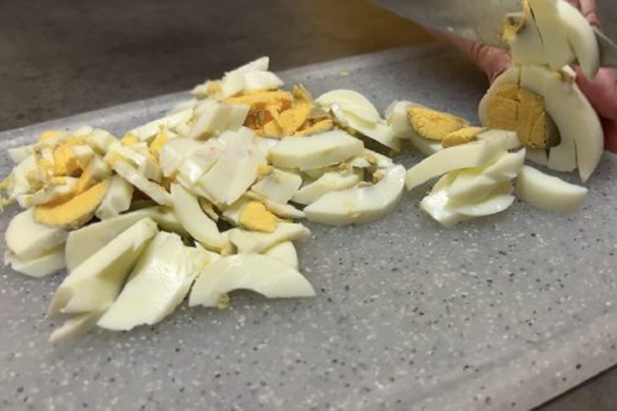 Salātu bļodā pieliekam sasmalcinātas vārītas olas.