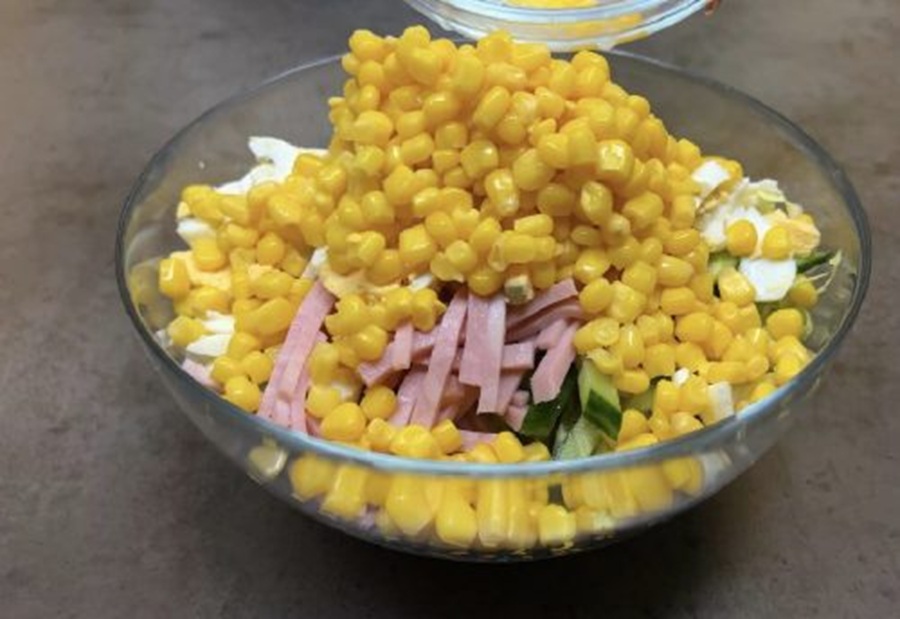 Tad pievienojam bundžu konservētas kukurūzas, iepriekš notecinot šķidrumu.